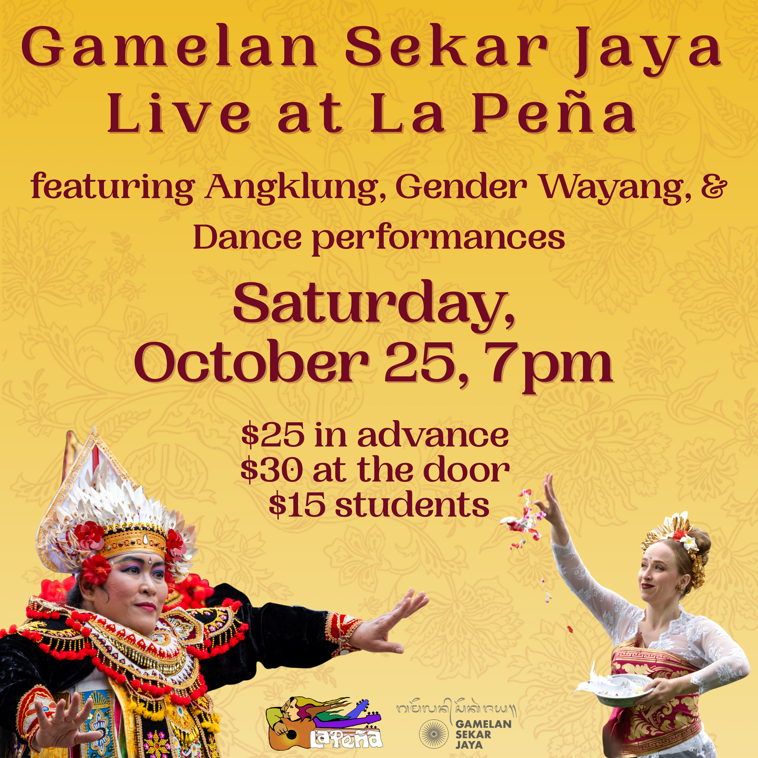 Gamelan Sekar Jaya’s Angklung, Gender Wayang, and Dance ensembles are bringing the magic of Bali to La Peña Cultural Center!